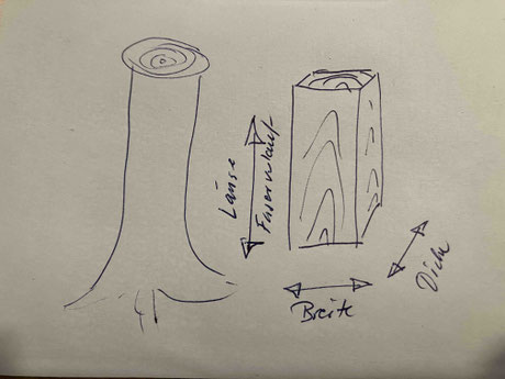 Im Bild sehen Sie links einen Baum. Der Baum wächst in den Himmel Richtung Sonne. Das ist die Wachstumsrichung oder Faserverlauf. In den Fasern werden die Nährstoffe und Wasser aus dem Boden zu den Blätter transportiert. Der Baum auf dem Bild ist oben abgeschnitten. Da sehen Sie die Jahrringe. Wenn Sie die Jahrringe sehen, ist das Stirnholz und die beiden Masse auf dem Stück Holz rechts, bilden die Breite und Dicke.